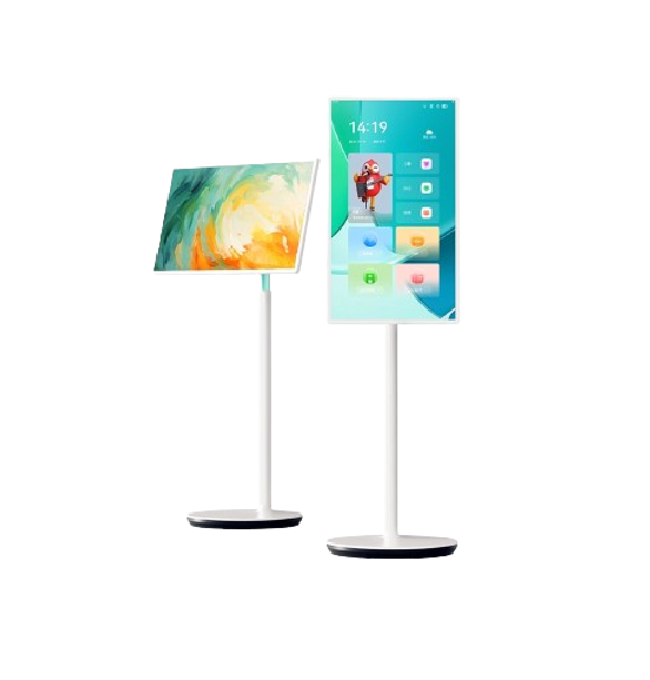 All-in-one free-standing and wall-mounted digital signage with CMS control, split-screen layout, and remote content management.